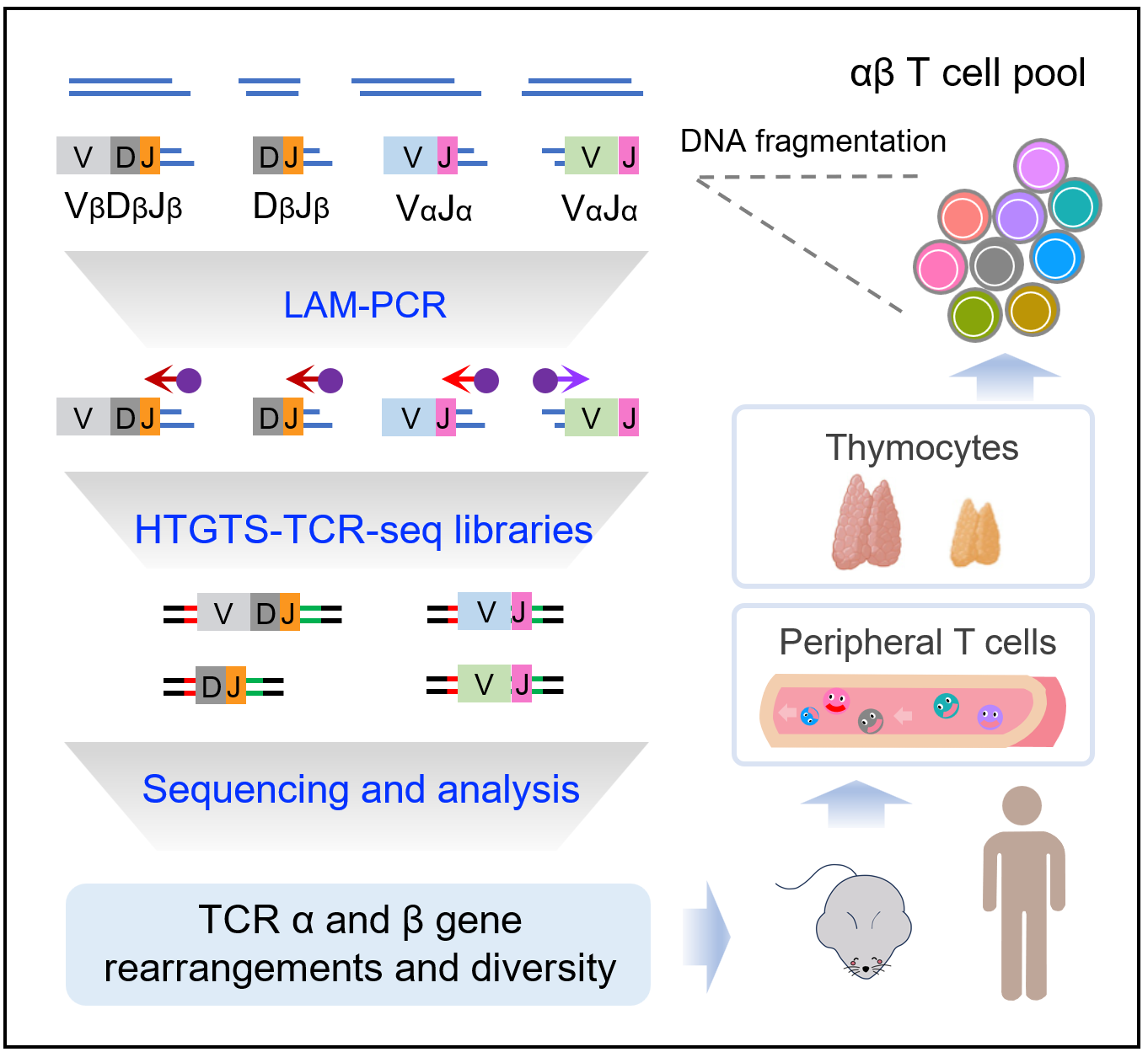 10月27日,國際學術期刊Advanced Science在線發表了中國科學院分子細胞科學卓越創新中心(生物化學與細胞生物學研究所)代海強研究組聯合吳薇研究組的研究成果:”HTGTS‐TCR‐Seq for Profiling of Mouse and Human T‐Cell Receptor α and β Gene Rearrangements and Diversity”。該研究基于高通量全基因組易位測序(HTGTS)技術,開發了新型DNA測序方法HTGTS-TCR-seq,旨在精準解析αβ T細胞受體(TCR)的重排過程。