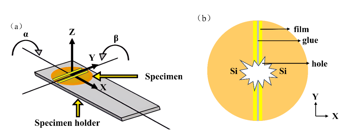 圖1 薄膜TEM截面樣品傾轉示意圖。(a):雙傾桿傾轉示意圖;(b):薄膜TEM截面樣品放置在樣品桿中的方向示意圖。