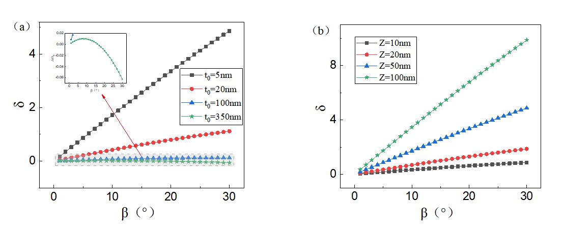 圖 2 相對誤差δ隨傾轉角度β變化的計算結果。(a):Z=50nm,不同t0的薄膜;(b):t0=5nm,不同Z的薄膜。