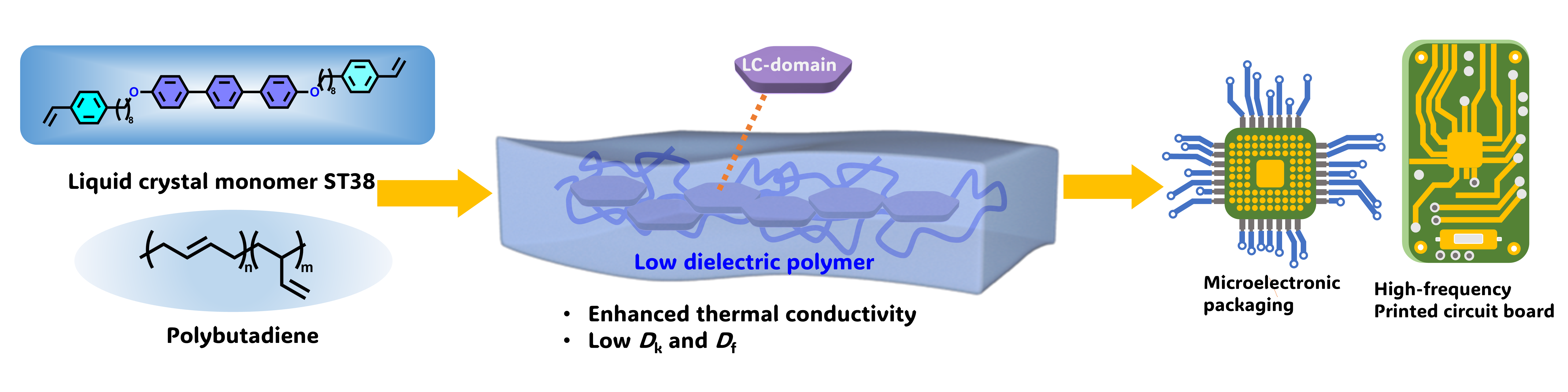 高頻通信和人工智能的迅速發展推動了微電子器件向著高速傳輸,集成化和小型化方向發展。然而,電子器件性能的提升也同時帶來了電子串擾、阻-容延遲和熱量積累等問題。為了解決這些問題,需要電介質材料具有低介電常數(Dk)和低介電損耗(Df)以及高導熱率,以確保信號傳輸的速度和質量,并同時提高散熱性,延長器件的使用壽命。然而,如何實現材料兼具低介電和高導熱的特性仍是一大挑戰。中國科學院上海有機化學研究所房強課題組長期開展低介電常數材料的研究,近期在Advanced Materials雜志發表題為Enhancing Thermal Conductivity in Low Dielectric Polybutadiene via a Liquid Crystal Ordering Effect (https://doi.org/10.1002/adma.202517027) 的論文,利用液晶有序效應提升了聚丁二烯的導熱性能,制備了導熱性能良好的低介電液晶聚合物。
