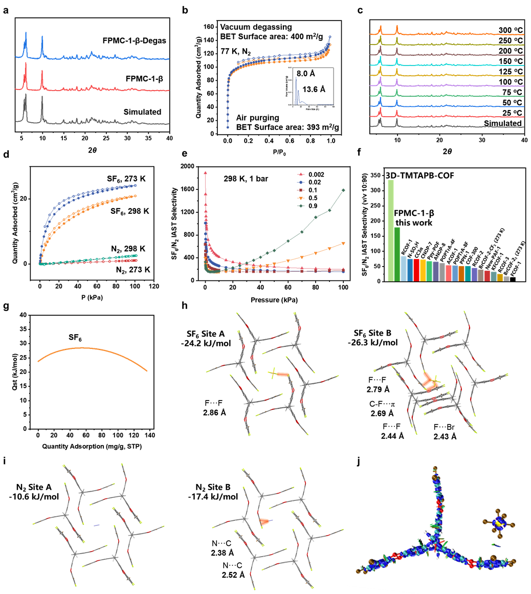 圖1. FPMC-1-β的結晶性、多孔性熱穩定性、SF6吸附分離性能及吸附位點結構