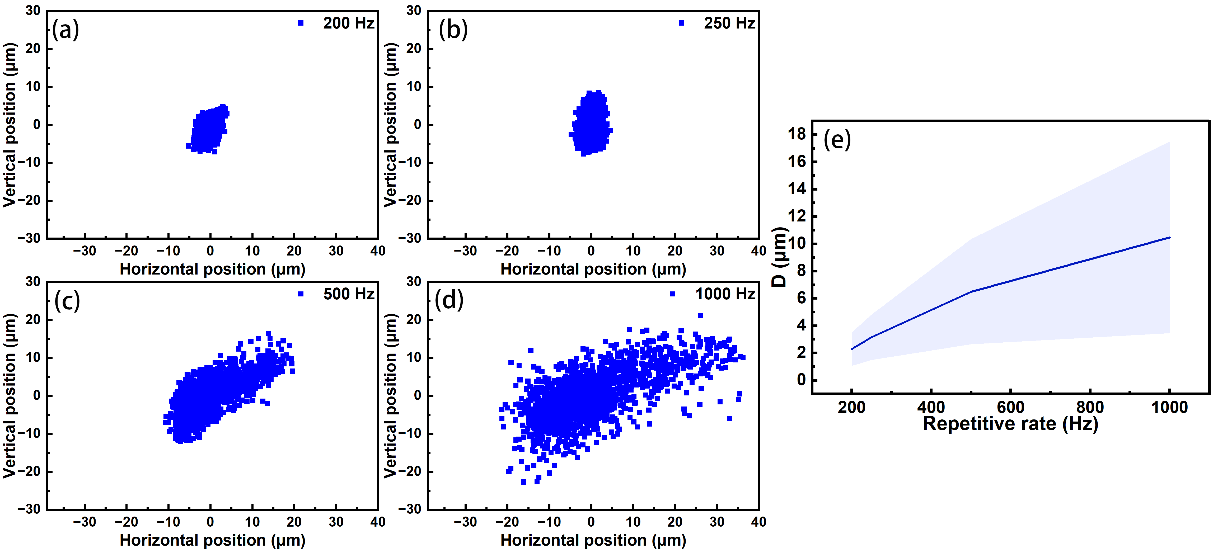 圖1?不同重復頻率下的光絲產生太赫茲光束指向分布云圖。(a)200Hz,(b)250Hz,(c)500Hz,(d)1000Hz;(e)光束指向平均偏差距離(藍色實線)和其誤差(藍色陰影)隨激光重復頻率變化的函數。