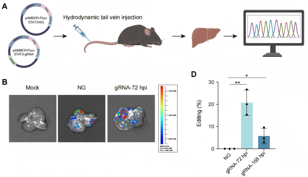 圖:AMBER編輯器在小鼠肝臟中的表達及編輯功能驗證。(A) AMBER 體內遞送及編輯驗證示意圖;(B)通過與 AMBER 融合表達的 Fluc 信號驗證編輯系統在肝組織中的成功遞送與表達;(C) 注射后 72 h 與 168 h 時肝組織中靶位點的編輯效率。